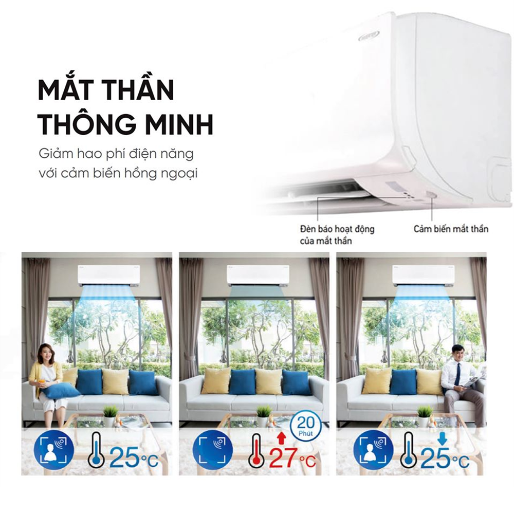 Mắt thần trên FTKM hoạt động theo cơ chế tự động phát hiện chuyện động của người sử dụng trong phòng, nếu không có bất kỳ hoạt động nào được ghi nhận trong 20 phút, máy sẽ tự động điều chỉnh nhiệt độ tăng 2 độ C và ngược lại giảm 2 độ C khi phát hiện có người dùng trong phòng.